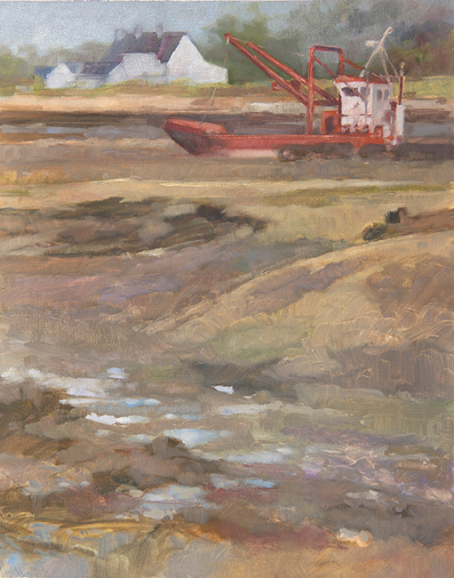 Nouvelle peinture sur le même sujet. Pour ne pas couper ma peinture en deux zones distinctes (eau et estran), j’ai supprimé l’eau et redonné la priorité au sujet (bateau) après l’avoir remis dans de bonnes proportions.